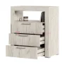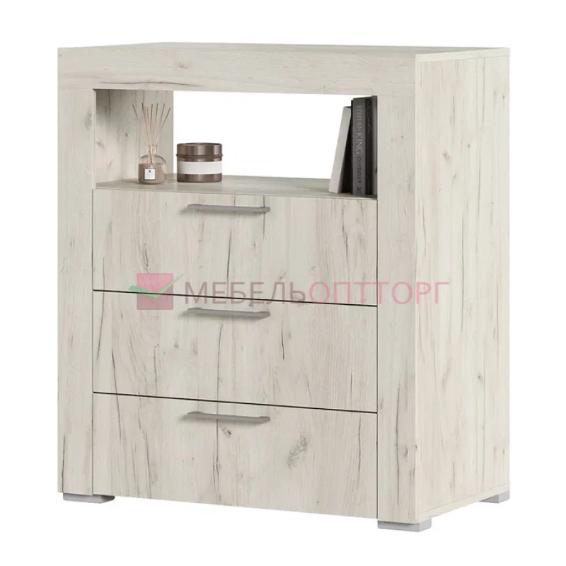 Компактный комод Гранд создан в соответствии со стилем серии и представляет собой высокую тумбу, предназначенную для организации хранения вещей и размещения интерьерных предметов. Он состоит из открытой полки и трех вместительных выдвижных ящиков, а поверх него вы сможете разместить декоративные элементы, цифровую технику или любимые фотографии.