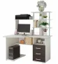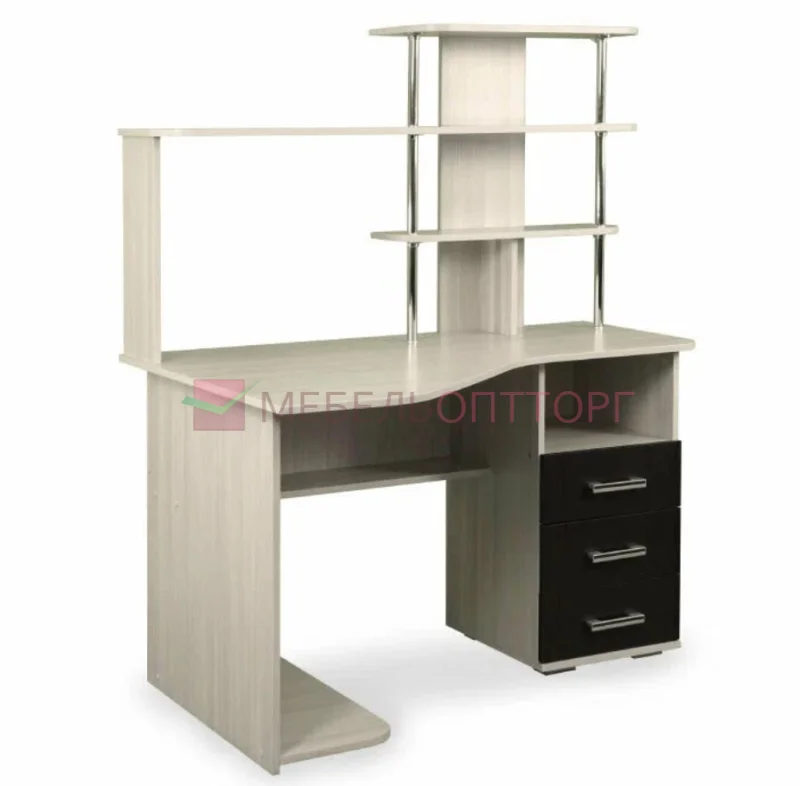 Модель выполнена из светлой ЛДСП цвета лоредо, фасады трех выдвижных ящиков - в темном цвете венге, стол имеет много открытых полок для размещения необходимых в работе или учебе вещей, вместительная столешница с анатомическим углублением.
