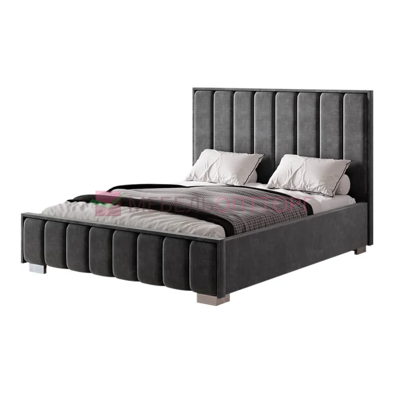 Изделие прекрасно будет смотреться в любом интерьере за счет велюра цвета графит, используемого в дизайне, корпус кровати изготовлен из высококачественной ЛДСП, мягкое изголовье имеет вертикальные стяжки, что придает модели элегантности.