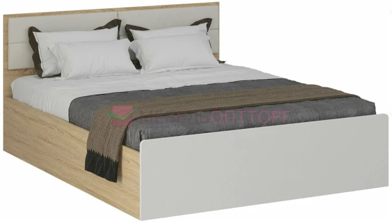 Цвет: корпус – дуб сонома, фасад – софт пломбир, изголовье имеет мягкий элемент (декор) из экокожи белого цвета.