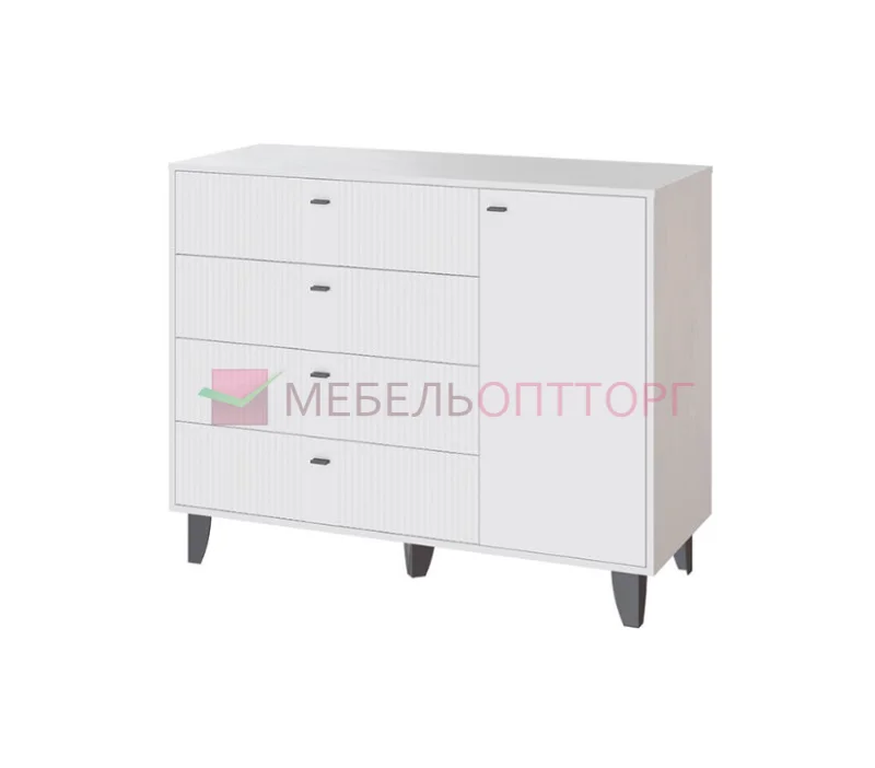 Комод Катрин-13 — это стильный и функциональный элемент интерьера, который станет отличным дополнением к вашей спальне или гостиной. Он выполнен в современном стиле и имеет комбинированную конструкцию, четыре выдвижных ящика и полки за распашными фасадами.