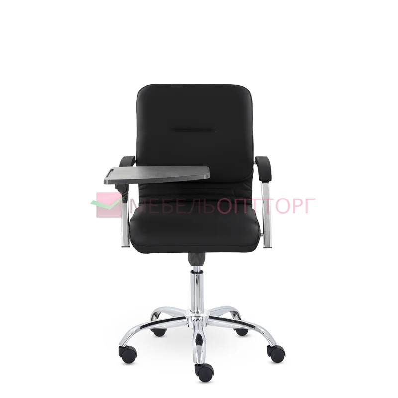 Улучшенная комплектация кресла включает горизонтальные прострочки, соединяющие спинку и сиденье, что придает креслу современный нео-классический стиль. Удобные накладки обеспечивают комфортную поддержку рук и способствуют их расслаблению. К креслу прилагается столик, выполненный из пластика. Модель отлично подойдет для конференц-залов, переговорных, актовых залов.