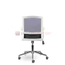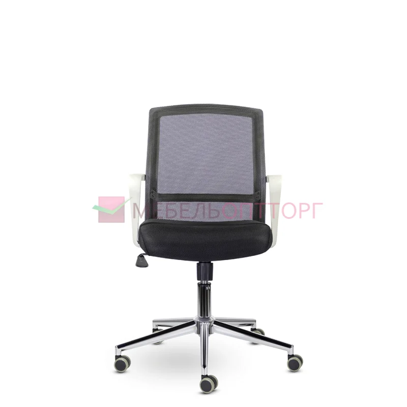 Кресло стоит на хромированной крестовине, что обеспечивает максимальную нагрузку в 120 кг. Широкая эргономичная спинка обтянута прочной сеткой, пластиковые подлокотники белого цвета, соединенные с каркасом.