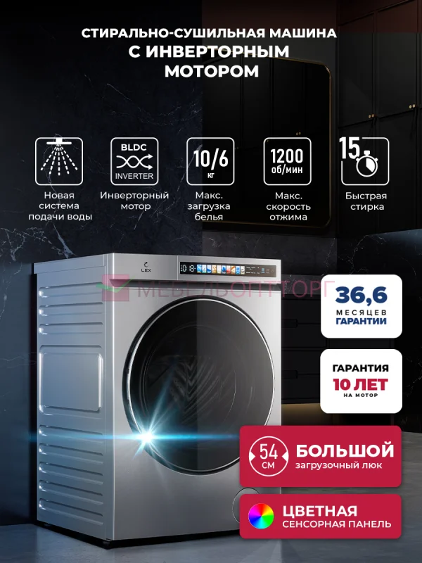 <h3>Стирально‑сушильная машина LEX LWM 10612 MAGNA: два прибора в одном — максимум удобства</h3><p>Забудьте о долгой сушке белья! Модель LEX LWM 10612 MAGNA объединяет стирку и сушку в одном устройстве — экономия места и времени без ущерба для качества ухода за вещами.</p><p>Ключевые преимущества</p><h3>1. Вместительность и удобство загрузки</h3><ul><li style="font-weight: 400;" aria-level="1">стирка — до 10 кг;</li><li style="font-weight: 400;" aria-level="1">сушка — до 6 кг;</li><li style="font-weight: 400;" aria-level="1">барабан большого объёма и люк 54 см — легко загружать объемные вещи (пуховики, одеяла).</li></ul><h3>2. Инверторный мотор — тишина и надёжность</h3><ul><li style="font-weight: 400;" aria-level="1">минимальный шум во время работы;</li><li style="font-weight: 400;" aria-level="1">энергоэффективность и экономия на электричестве;</li><li style="font-weight: 400;" aria-level="1">устойчивость к перепадам напряжения.</li></ul><p>Гарантия:</p><ul><li style="font-weight: 400;" aria-level="1">10 лет на мотор;</li><li style="font-weight: 400;" aria-level="1">36,6 месяцев на устройство.</li></ul><h3>3. Инновационная система подачи воды и стабилизации</h3><p>Новая система подачи воды — распыление под давлением создает готовую смесь порошка с водой, что ускоряет стирку и повышает ее качество. Дополнительно:</p><ul><li style="font-weight: 400;" aria-level="1">высокоэффективное полоскание;</li><li style="font-weight: 400;" aria-level="1">возможность стирки в холодной воде с сохранением результата.</li></ul><p>Система стабилизации (4 амортизатора, антивибрационные подушки, балласт) — тихая и устойчивая работа даже на высоких оборотах.</p><h3>4. 10+ программ для любых задач</h3><ul><li style="font-weight: 400;" aria-level="1">Быстрая 15 мин — срочная стирка;</li><li style="font-weight: 400;" aria-level="1">Верхняя одежда — бережный уход за куртками;</li><li style="font-weight: 400;" aria-level="1">Гигиена — дезинфекция;</li><li style="font-weight: 400;" aria-level="1">Сушка — идеально сухие и ухоженные вещи сразу после стирки;</li><li style="font-weight: 400;" aria-level="1">и еще более 6 программ на любой случай.</li></ul><p>Дополнительная функция:</p><ul><li style="font-weight: 400;" aria-level="1">замачивание — для борьбы с сильными загрязнениями.</li></ul><h3>5. Эффективная сушка без вреда для вещей</h3><ul><li style="font-weight: 400;" aria-level="1">стирка + сушка за 1 час — экономия времени;</li><li style="font-weight: 400;" aria-level="1">антистатический эффект — нет прилипания ворса;</li><li style="font-weight: 400;" aria-level="1">бережная сушка — без усадки, повреждений, катышков;</li><li style="font-weight: 400;" aria-level="1">вещи сохраняют первоначальный вид и структуру тканей.</li></ul><h3>6. Удобное управление</h3><ul><li style="font-weight: 400;" aria-level="1">цветная сенсорная панель — интуитивный интерфейс и легкий выбор режимов.</li></ul><h3>7. Мощный отжим</h3><ul><li style="font-weight: 400;" aria-level="1">1200 об/мин — белье почти сухое, меньше времени на сушку.</li></ul><p>LEX LWM 10612 MAGNA — ваш универсальный помощник: стирает, сушит, экономит время и пространство!</p>