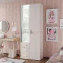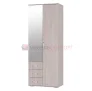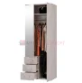 Модель имеет отделение с хромированной штангой для одежды на вешалках, три выдвижных ящика для белья и аксессуаров, а также верхнюю полку.