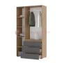 Трёхстворчатый шкаф Хелен ШК 06 с двумя распашными створками неполной высоты, открывающиеся захватом снизу, укомплектованы хромированной штангой для одежды. В нижней части шкафа — три ящика полного выдвижения. Боковая секция модуля в виде глухого пенала открывается с помощью отталкивателя и оснащена полками.