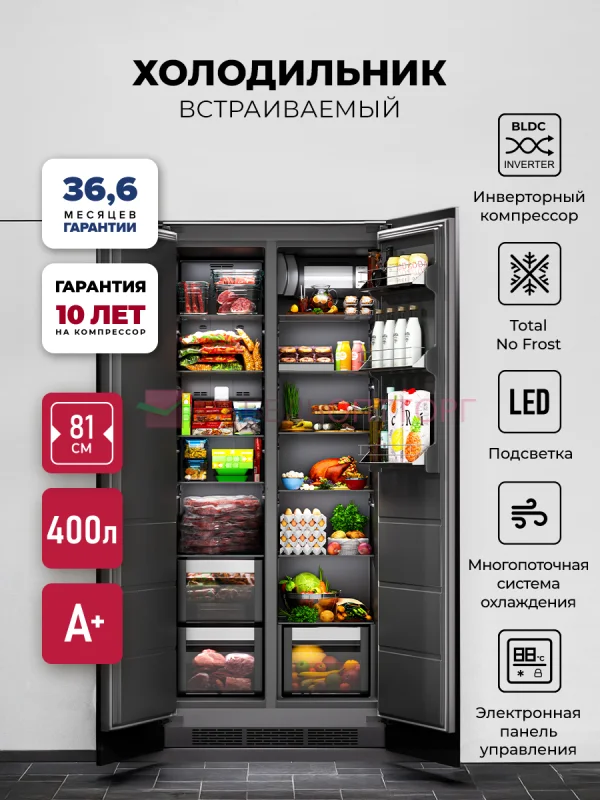<p style="font-weight: 400;">Двухкамерный встраиваемый холодильник LEX LBI400SB GREY имеет хороший функционал и в то же время очень прост в эксплуатации. Технология Total No Frost значительно упрощает обслуживание и помогает устанавливать оптимальную температуру и влажность. При большом объеме 400 л, мощной заморозке и яркой подсветке эта модель высотой 185,5 см и шириной 80,6 см обладает прекрасной энергоэффективностью и низким уровнем шума. Электронная панель управления удобна и долговечна, а режим сохранения температуры выручит при отключении электричества. Для вашего комфорта холодильник оснащен дополнительными функциями:</p>