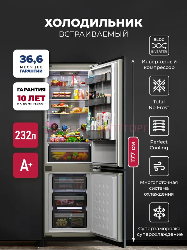 Встраиваемый двухкамерный холодильник LEX LBI177.3ID имеет хороший функционал и в то же время очень прост в эксплуатации. Внутренняя отделка холодильника и морзильника выполнена в серых тонах. Технология Total No Frost значительно упрощает обслуживание и помогает устанавливать оптимальную температуру и влажность. При большом объеме, мощной заморозке и яркой подсветке эта модель высотой 177 см обладает прекрасной энергоэффективностью и низким уровнем шума. Электронная панель управления удобна и долговечна, а режим сохранения температуры выручит при отключении электричества. Для вашего комфорта дверцу холодильника можно закрепить справа или слева; а функция "сигнал при открытой дверце" позаботится о том, чтобы она всегда была герметично закрыта. Модель оснащена ящиком, в котором можно отдельно настраивать уровень влажности, создавая идеальные условия для хранения разных видов овощей и фруктов. Холодильник LEX LBI177.3ID оснащен современным инверторным компрессором, который гарантирует эффективную и практически бесшумную работу. Он также обеспечивает низкий расход энергии и долго поддерживает температуру без электропитания.