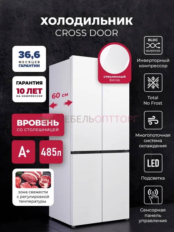 Холодильник Cross Door с инверторным компрессором будет радовать вас многие годы. Модель со стеклянными дверьми станет ключевым элементом дизайна вашей кухни. Вентиляция у холодильника находится в нижней части, поэтому его можно интегрировать в любой шкаф или стену.