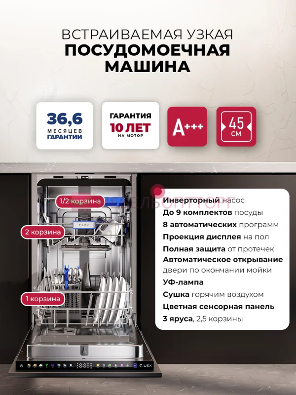 LEX PM 4583А color Lux — это идеальное решение для тех, кто ценит функциональность, удобство и безопасность. Две вместительные корзины и одна половинная корзина для столовых приборов, за счет которой у вас есть возможность мыть высокие бокалы, тарелки и крышки. Полностью сенсорная панель из закаленного стекла с цветными изображениями придает модели современный вид и повышает её надежность.