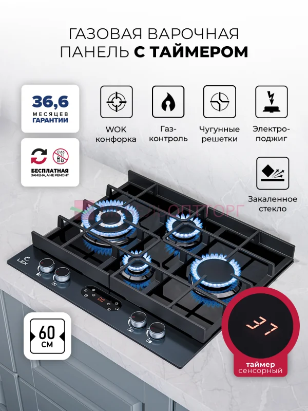 Варочная панель газовая с сенсорным таймером LEX GVG 644T M BBL Газовая варочная панель