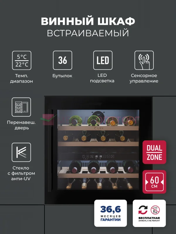 Винный шкаф встраиваемый LEX LWD6036BL dual zone / Встраиваемый