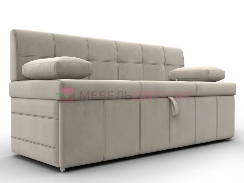 Лео – прямой диванчик для маленькой кухни, способный в считанные минуты превратиться в удобную односпальную кровать. Спинка высокая, прямая, подлокотники выполнены в форме подушек. Изделие не займет много места. Габариты минимальны.