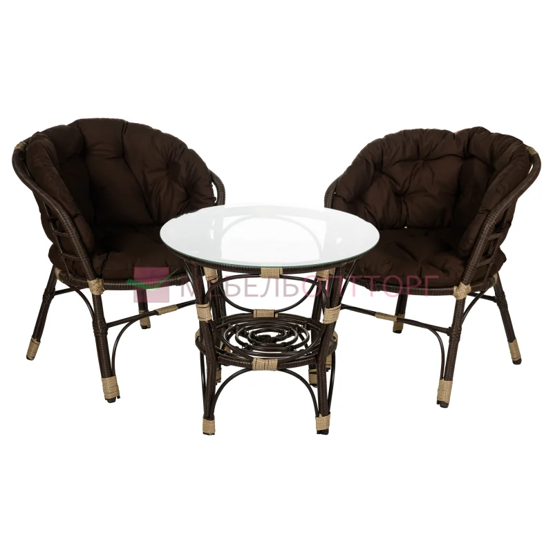 Набор мебели Багамы Лайт арт.BG3325 коричневый, коричневый 5у(1штаб-2 кресл+2уп подуш+стол+стекл),иск ротанг корич,подуш корич) (Б)