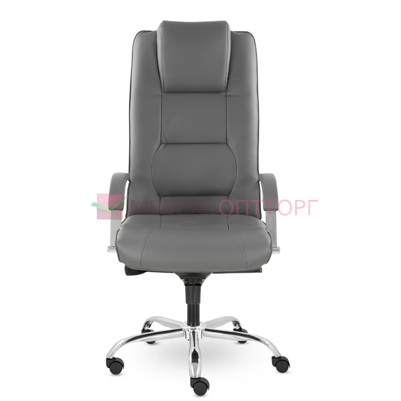 Грациозное кресло руководителя с ярко выраженным мягким подголовником. Спинка и сидение имеют горизонтальные прострочки, делящие их на квадраты. Хромированные подлокотники с мягкими накладками. Кресло стоит на хромированной крестовине, максимальная нагрузка которой 180 кг.