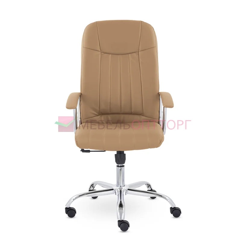 Кресло руководителя с мягкими увеличенными подушками. Широкая эргономичная спинка имеет две горизонтальные прострочки, которые отделяют подголовник от основной части спинки. Благодаря глубокому сиденью, в кресле будет удобно человеку среднего и высокого роста. Длинные хромированные подлокотники способствуют комфортной посадке в кресле. Максимальная нагрузка до 180 кг.