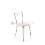 Воздушная модель стула имеет интересный дизайн спинки, представляющую собой крестообразное пресечение нескольких металлических нитей, образующих в центре маленькие ромбики. Каркас стула выполнен из хромированного металла